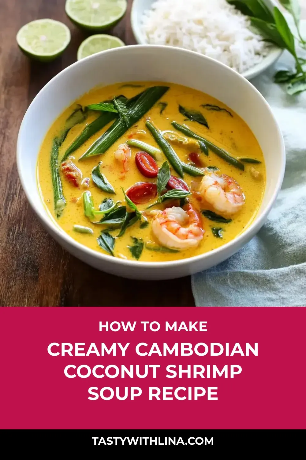 Creamy and fragrant Cambodian Coconut Shrimp Soup – a comforting bowl of zesty lemongrass, creamy coconut milk, and succulent shrimp for a taste of Southeast Asia.
