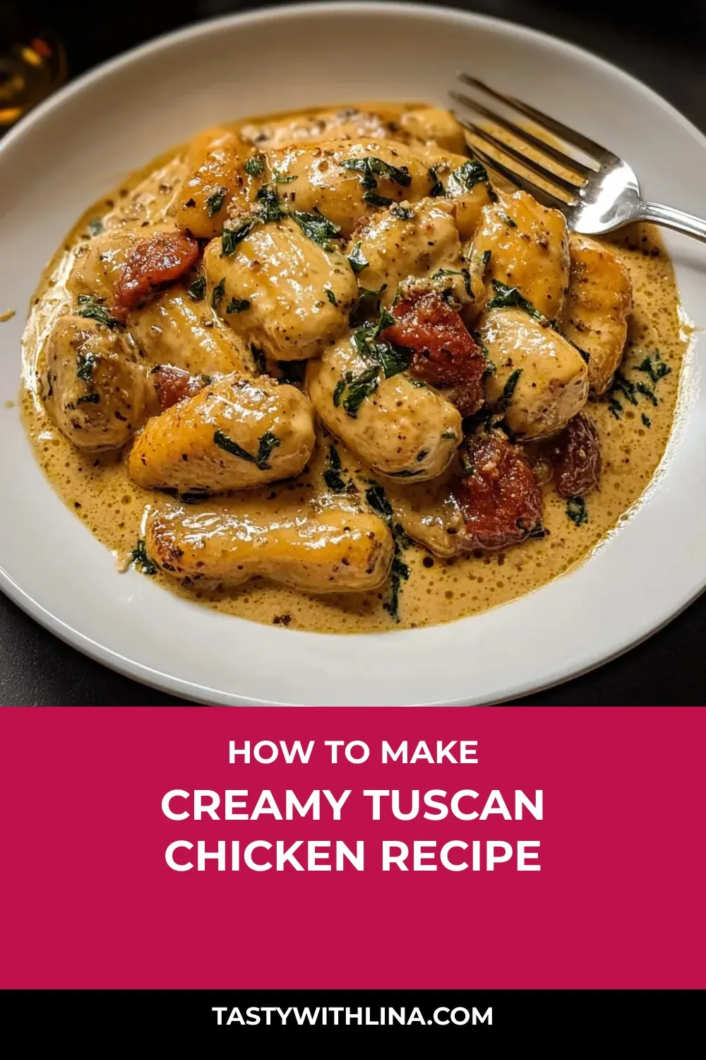 For a stunning presentation, serve this Tasty Tuscan Chicken Cream Dish over a bed of al dente linguine or creamy mashed potatoes. Garnish with fresh basil leaves and a sprinkle of extra grated parmesan for an elegant touch. The vibrant colors and flavors will make any dinner feel like a special occasion.