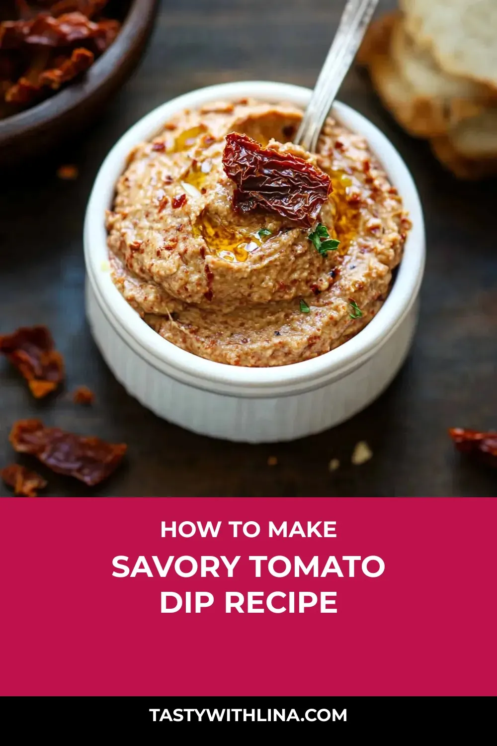 Another fun way to serve this tomato dip is to create a DIY crostini station. Offer an assortment of freshly toasted baguette slices along with different toppings like sliced olives, roasted red peppers, and crumbled feta cheese. Let your guests build their own crostinis by spreading the sun-dried tomato dip as the base, then adding their favorite toppings for a customizable and interactive appetizer experience.